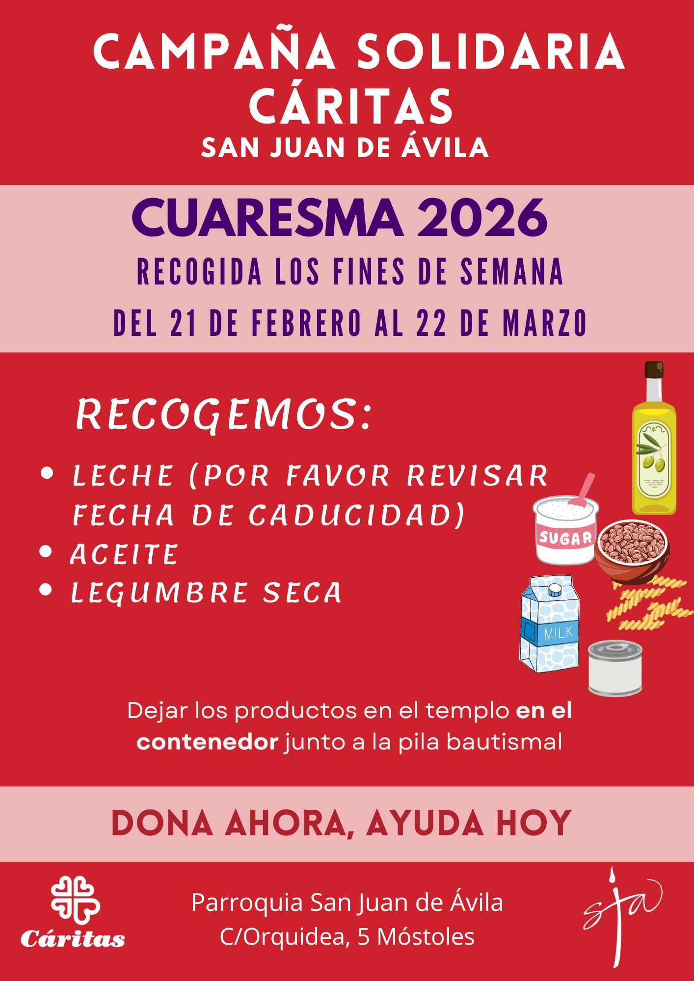 Los fines de semana de Cuaresma, del 21 de febrero al 22 de marzo de 2026 tendremos una campaña especial de Cáritas para recoger alimentos que necesitan las familias a las que asisten.