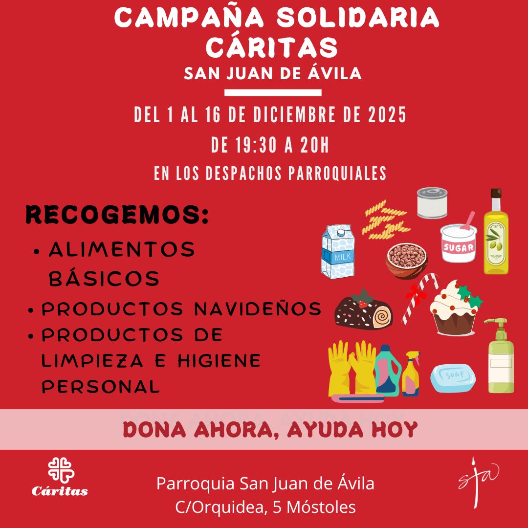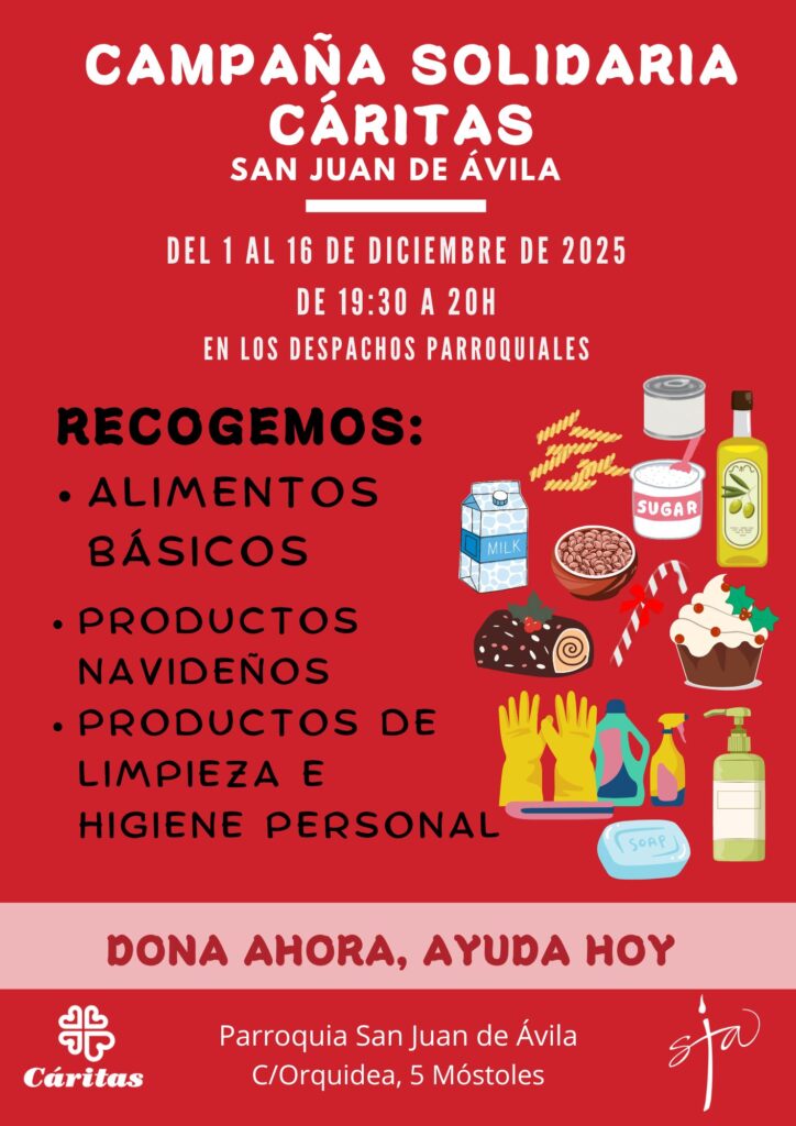 Desde el 1 al 16 de diciembre de 2025 de 19:30 a 20H en los despachos parroquiales se recogerán los productos para la campaña especial por Navidad de Cáritas