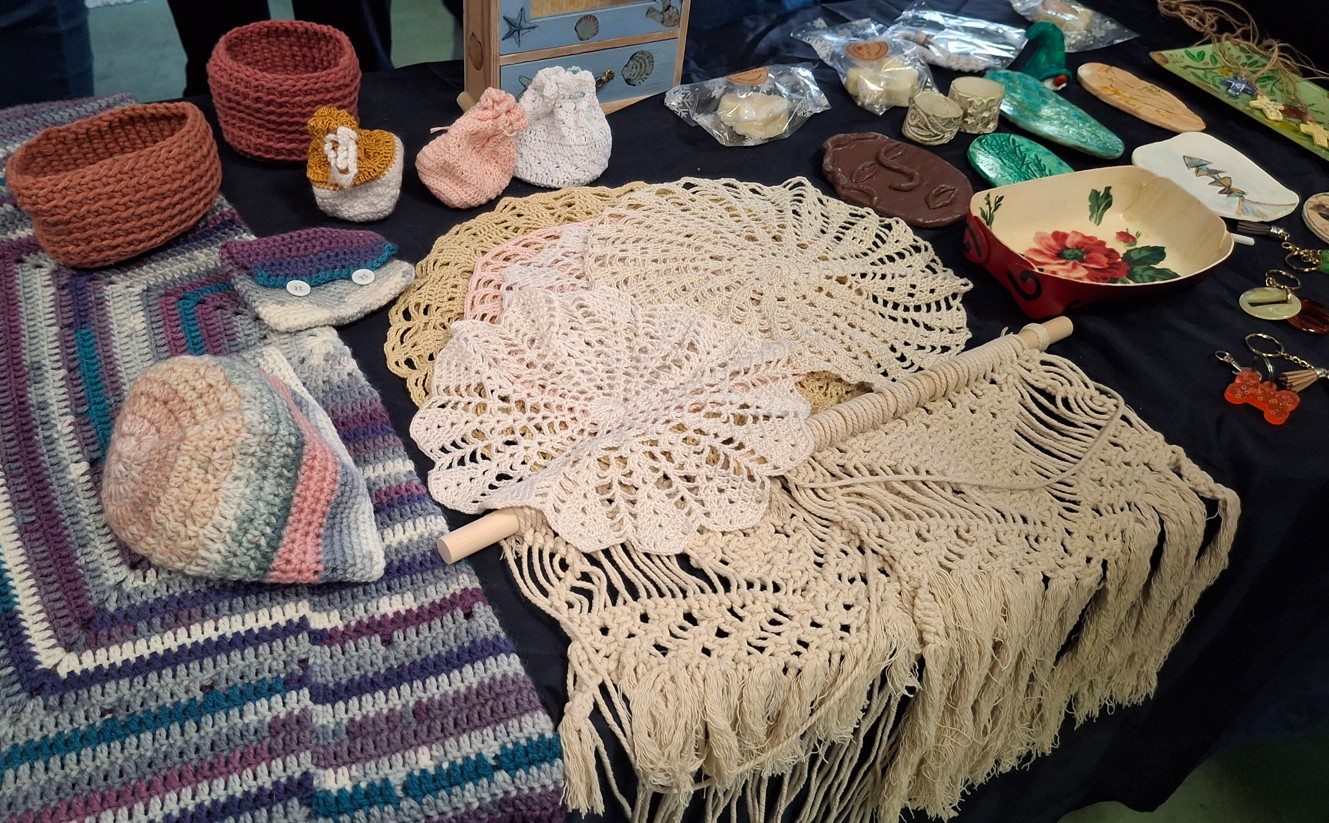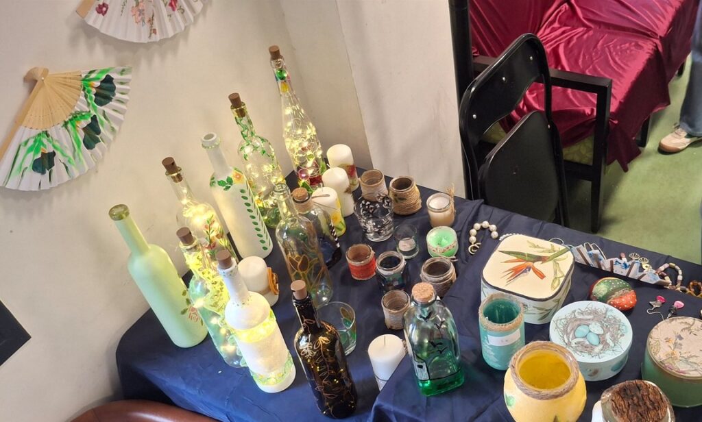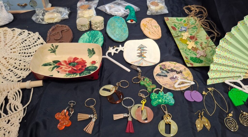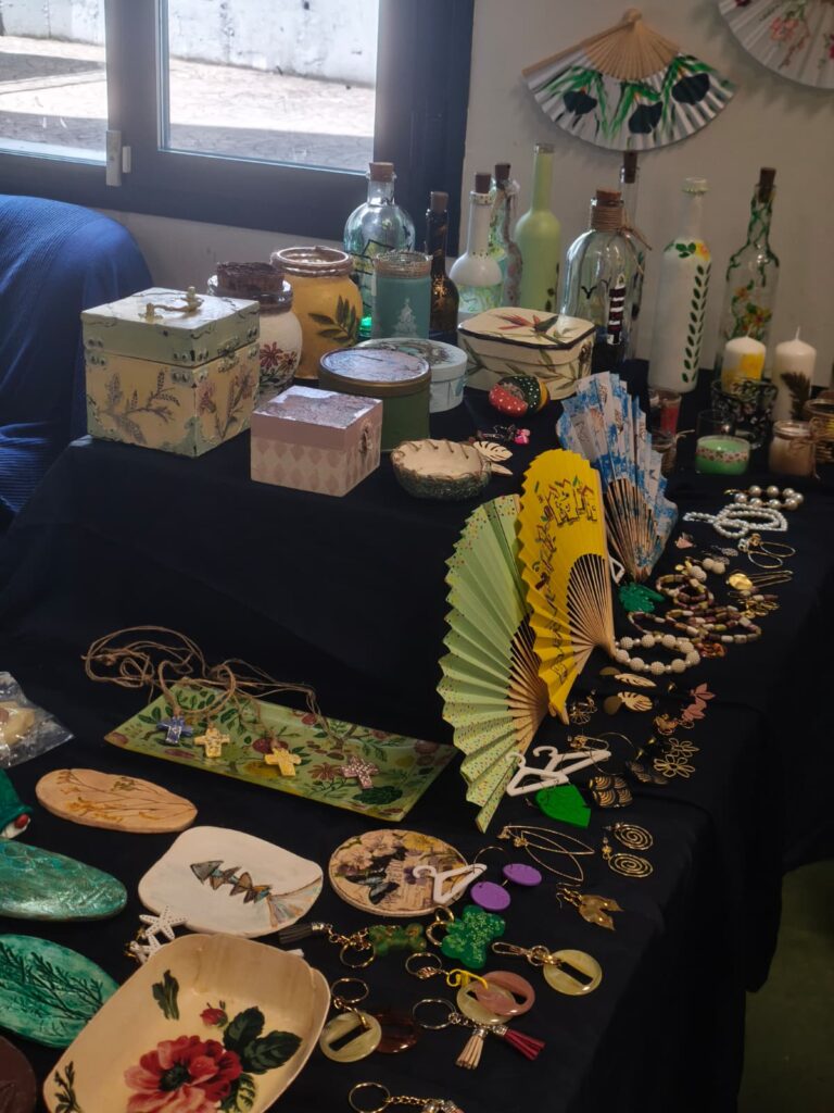 A continuación pasamos a la Exposición de Manualidades donde pudimos ver en detalle una muestra de la artesanía que nuestras artesanas del Grupo de Manualidades están preparando para vender en la Fiesta de San Juan de Ávila que se celebrará el próximo sábado 9 de mayo de 2026.