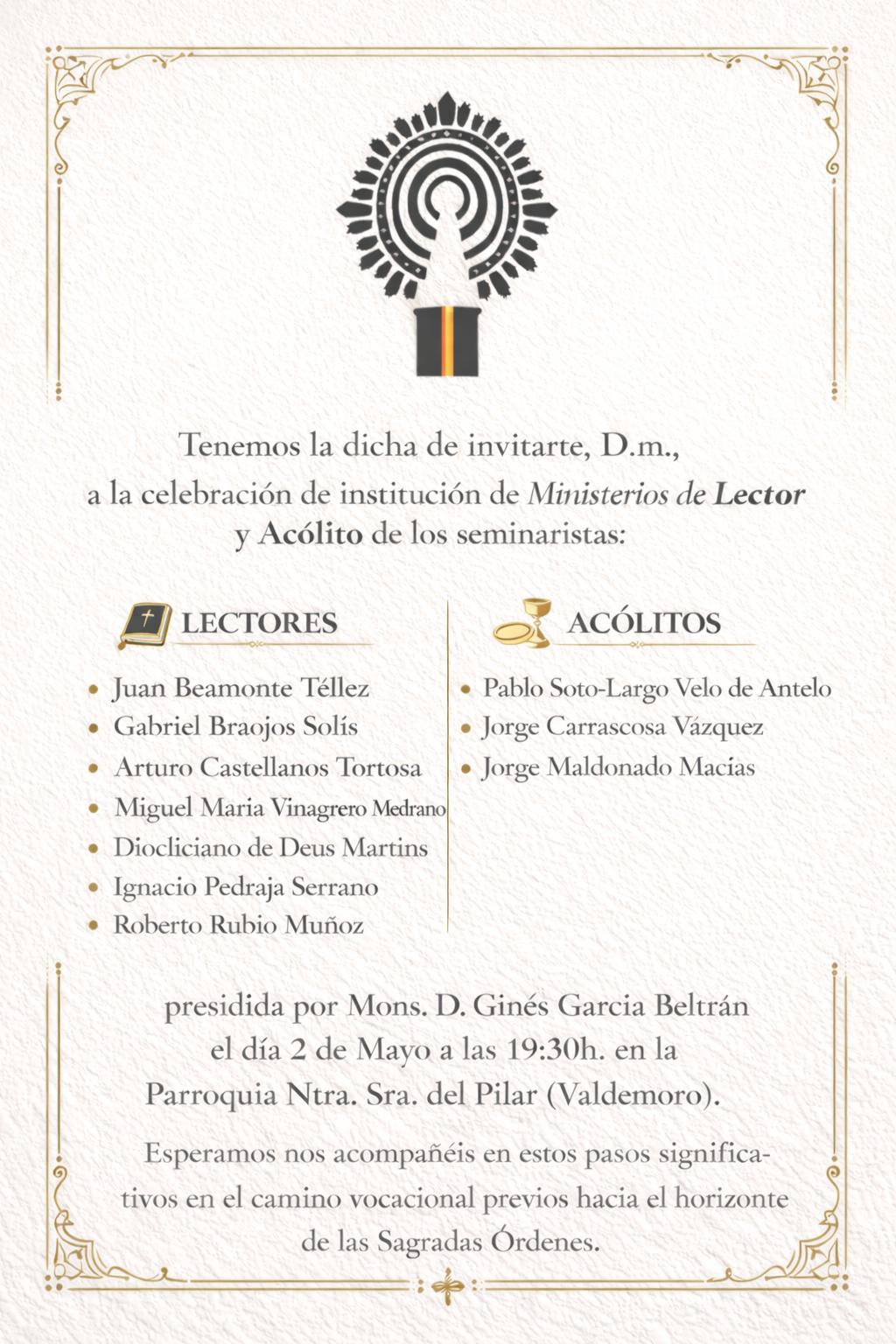Nuestros seminaristas nos invitan este 2 de mayo de 2026 a las 19:30H en la Parroquia Ntra. Sra. del Pilar (Valdemoro) a compartir con ellos este momento tan especial como es la institución de los Ministerios de Lector y Acólito.