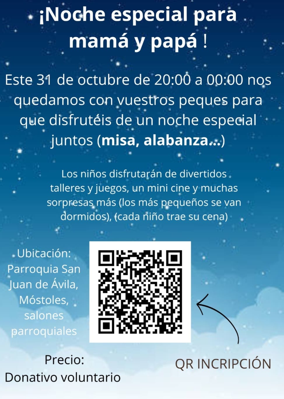 El viernes 31 de octubre de 2025 de 20:00 a 00:00H nos quedamos con vuestros peques para que disfrutéis de una noche especial juntos (misa, alabanza…)