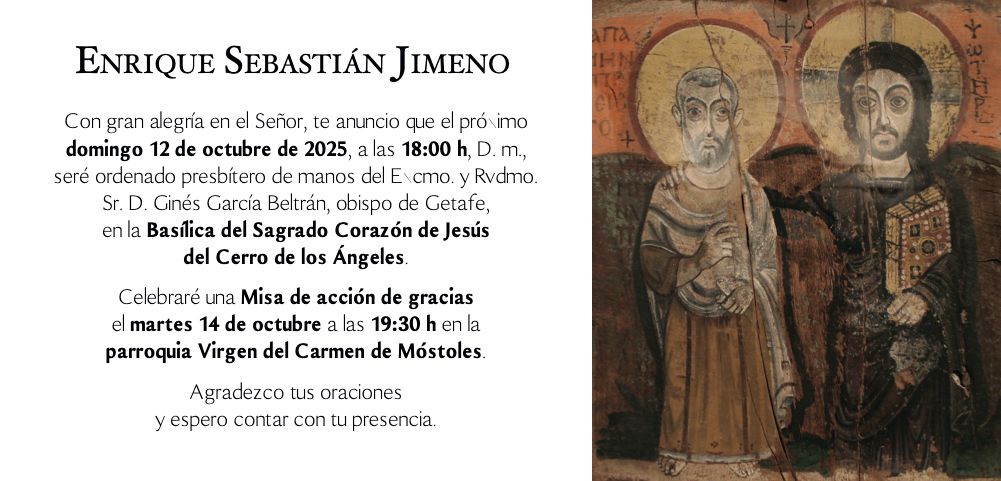 Con gran alegría en el Señor, te anuncio que el próximo domingo 12 de octubre de 2025, a las 18:00 h, D. m.,será ordenado presbítero de manos del Excmo. y Rvdmo. Sr. D. Ginés García Beltrán, obispo de Getafe, en la Basílica del Sagrado Corazón de Jesús del Cerro de los Angeles.