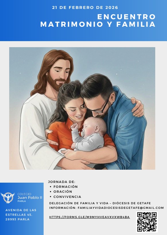 Colegio Juan Pablo II Parla Avenida de las Estrellas 45, Parla, Madrid, SpainENCUENTRO MATRIMONIO Y FAMILIA 2026 DELEGACIÓN DE FAMILIA Y VIDA – DIÓCESIS DE GETAFE📩 familiayvidadiocesisdegetafe@gmail.com 📅 21 de febrero de 2026 Colegio Juan Pablo II Leer más